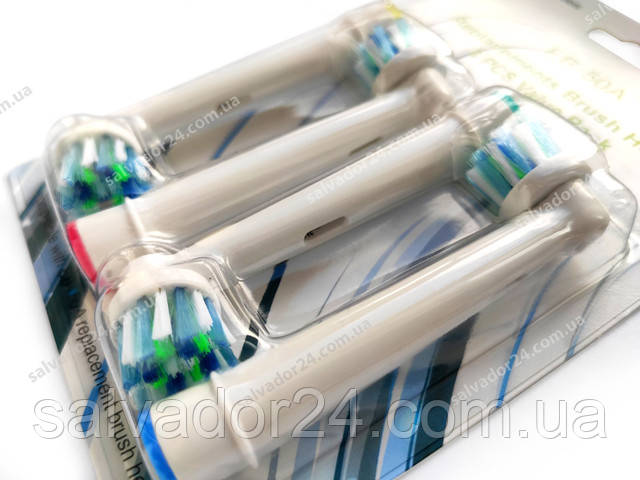 Змінна насадка EB50A є більш удосконаленою моделлю. Унікальність полягає в тому, що щетинки на головці насадки посаджені під кутом 16 градусів. Це дає їм можливість максимального проникнення в міжзубні проміжки. Розташування пучків щетинок у різному напрямку ефективно розпушує і видаляє зубний наліт і залишки їжі. Оптимальний розмір очисної головки насадки допомагає охоплювати кожен зуб окремо. Щетинки-індикатори блакитного кольору знебарвлюватимуться й говоритимуть про те, що насадку міняти.